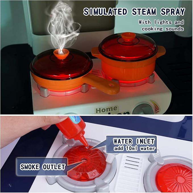 - 【Simulation spray gas stove】 Add 10 ml water to the left gas stove in the middle of the small hole, and turn on the switch, the gas stove will emit white smoke, it will also emit red light and frying sound. Smoke is tasteless and non-toxic to ensure the safety and health of children, mothers can rest assured that the children play. (3AA batteries required, not included)