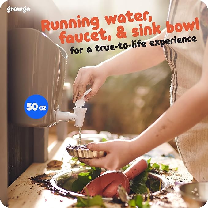 • WATER TAP - This toddler sink toy with running water lets kids easily mix mud batter & wash dishes! The stainless-steel sink is removable, while the 50 oz water tank has a functional faucet. With running water, kids will spend hours playing outside!
