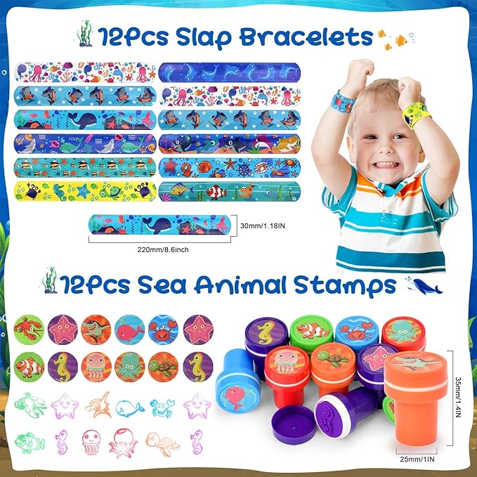 - đ ăPERFECT SEA ANIMAL PARTY GIFTăThere's something in here for everyone, Include 12 sea animal slap bracelets, 12 sea animal Kawaii stress relief toys, 12 cute sea animal rings, 12 sea animal keychains, 12 under the sea themed stamper, 12 under the sea temporary tattoos, 50 sea animal stickers. Make your sea animal party the best one!