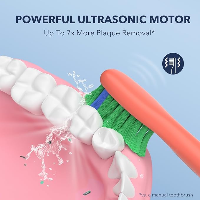 - 【Powerful Sonic Cleaning & 2-Mins Timer】--- Recommended by professional dentists --- [1] Ultrasonic toothbrush packed with the most up to date sonic technology for exceptional clean and remove up 7X plaques. It features a industry leading motor producing 40,000 vibrations per minute, can reach deep areas in the mouth that traditional toothbrushes may miss. [2] Built in smart timer control, 30 seconds interval reminding you to move to the next quadrant of your mouth, and totally in 2 minutes.