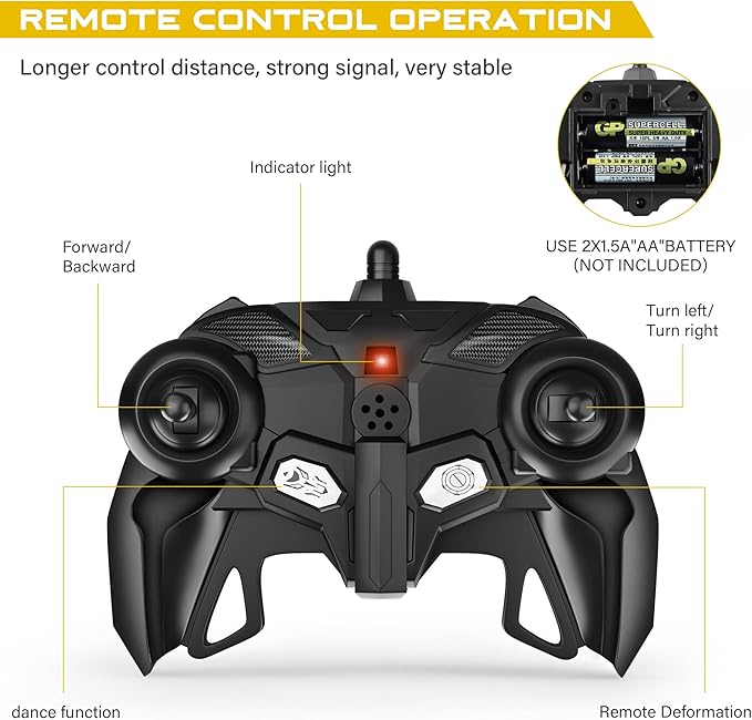 - Long Battery Life - 1*Lithium battery in car and charger line(All Include), 2*AA regular batteries in controller(Not include). The RC car has nifty LED headlights, good response to remote control and convenient to maneuver, the car turns on 360 degree movements, the transformation from robot to car is amazing. Demo mode is fun to watch, driving is even better, battery lasts good amount is a huge plus.
