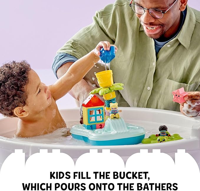- Fun floating toy to build in the tub – This bath-time toy comes with a floating island and turtle ring, flexible palm tree with a water bucket, octopus slide, 2 child figures, a sea star and rain-cloud pourers
