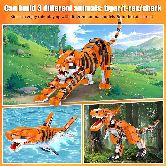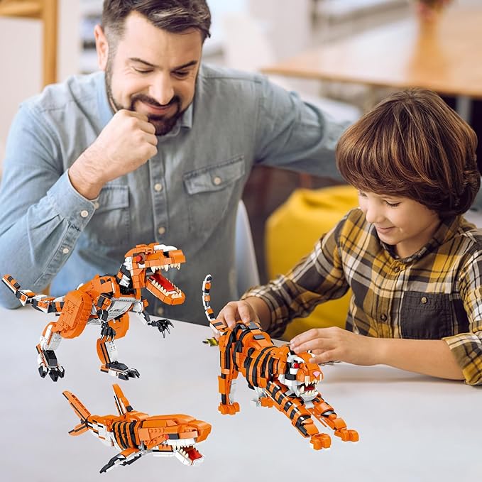 - 【3 In 1 Animal Building Blocks Toy Sets】Your kids can assemble Tyrannosaurus Rex, Tiger and Shark, The Kids can easier to learn & recognize the shape and structure of animal by building them, lmproves children's interest in building and color recognition ability. Enjoy the challenge of building an Tyrannosaurus Rex/Tiger/Shark, Then show off to friends and family, and add this beautiful display piece to your bedroom or den