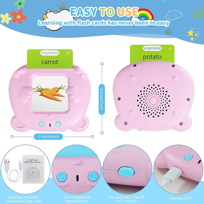 - 🔋【 USB Rechargeable 】This sight words talking flash cards supports USB charging and can be used for 5 hours on a single charge.The card reader weights 71g and size is 4*3.5*0.5(inch),light and small, easy to carry out