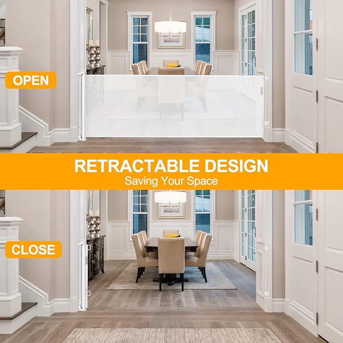 - Retractable Gate:the mesh of the extra long baby gate is retractable, so you can roll up the mesh when you are not using the long baby gate, saving you space.