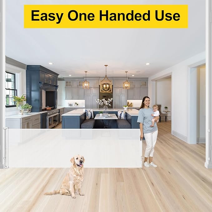 - [Baby Play Area] You can use the extra wide retractable baby gate to separate a safe play area for your baby in your home. Keep your dog out of the baby safety gate and do not disturb your baby.