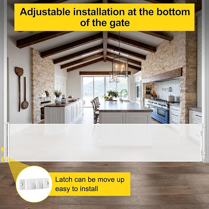 - [Adjustable Brackets Fit for any Baseboards] Our extra large retractable mesh gate accessories can be adjusted up and down to fit wall with baseboard according to the height of your baseboards. No need to buy extra spacers.