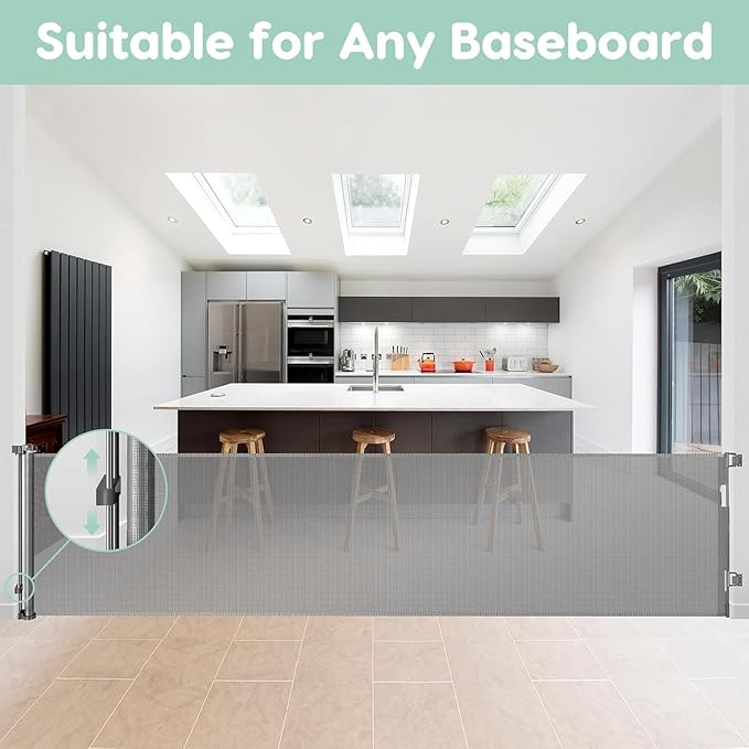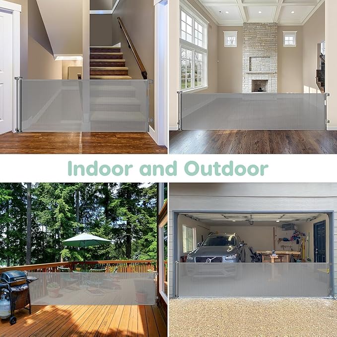 - Indoor / Outdoor Gate : extra long retractable baby gate can be used indoors and outdoors, such as in bottom of stairs, doorways, hallways, fireplaces, front doors, porches, garage doors, decks, patios.