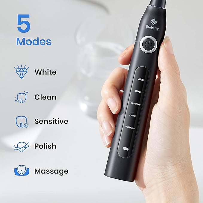 Etekcity Electric Toothbrush for Adults and Kids, 8 Soft High-Density Brush Heads, Fast Charge 2.5 Hours Last 30 Days, 2 Minutes Smart Timer, 5 Modes & Travel Case, Black