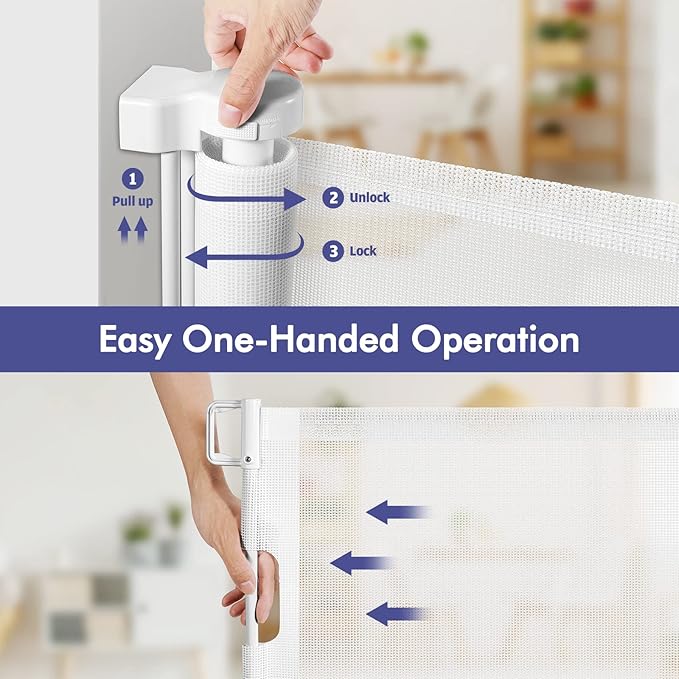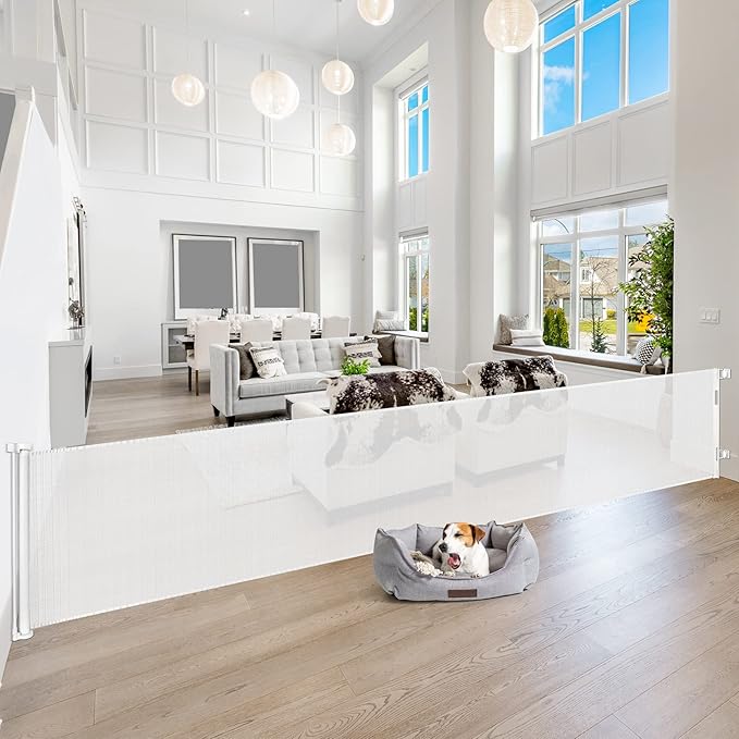 - [Retractable Gate to Save Space] - This retractable dog gate is easy to use in high traffic areas. When not in use or when guests are visiting, the retractable baby gate retracts to save space. Give your home more space and flexibility, and you don't have to worry about tripping over a bulky gate that's always in the way.