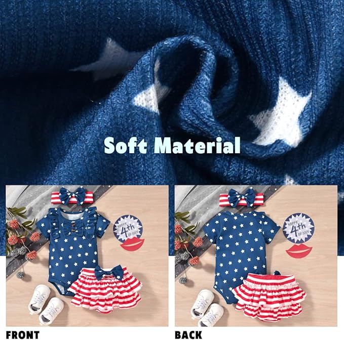 - PREMIUM COTTON MATERIAL : Crafted in soft cotton blend material, high absorbent and breathable, cozy feel of this baby clothing to keep little baby cool and comfy all summer. Are you ready to wrap your little baby up in this cute baby girls 4th of July outfit?