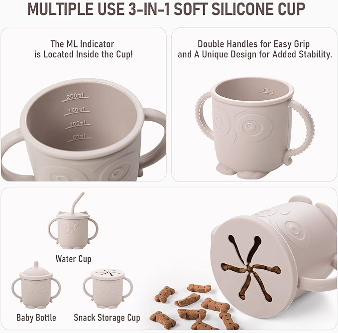 • Unique Designed Toddler Feeding Set: The baby spoon and fork in the infant weaning set are designed according to human mechanics, and the size is just suitable for babies aged 4 to 48 months; The matching silicone cup with 3 lids can not only serve as a baby bottle, also as a water cup and snack storage cup, babies can easily learn self-feeding skills using our silicone cup set.