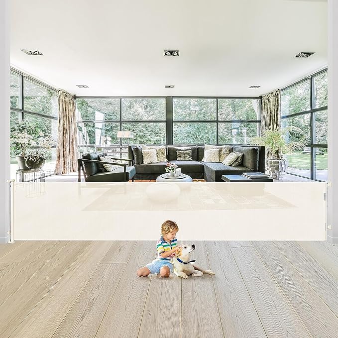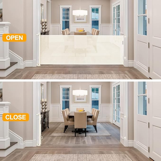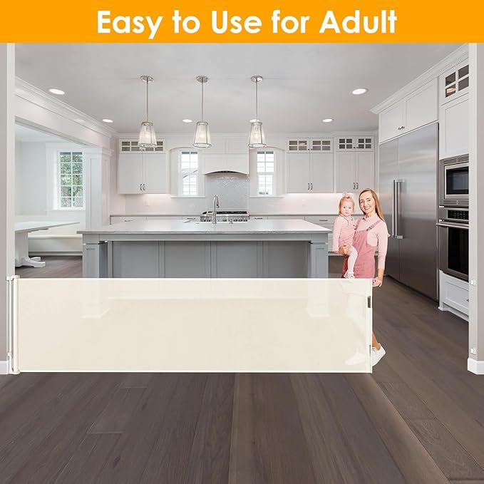 - [Retractable Gate ] You can roll it up when not in use, which saving your space. Unlike iron gate rails, this new retractable gate has no bottom rails - so there's no tripping hazard. Children and wheelchairs are easy to pass through, and elegant design works well with your home style. It is effective to stop your children from entering dangerous space.