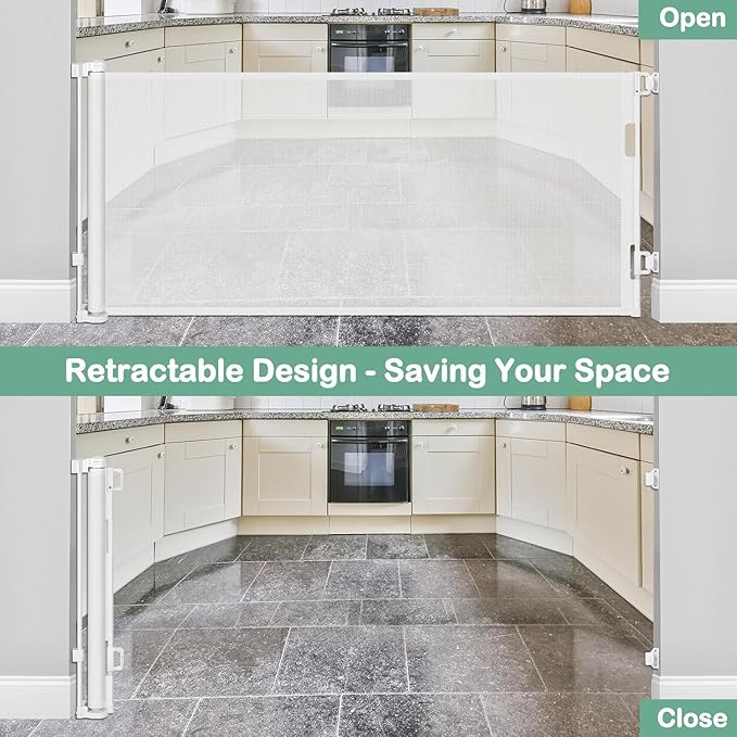 - Retractable Design - saving your space : retractable baby gates are retractable and can be rolled up when not in use without taking up space. Retractable baby gate height is 33 inches high, suitable for 0-55 inches wide doors.