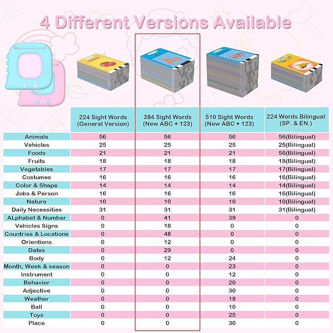 - 【Upgrade version & More cards】: Nibour 384 sight words talking flash cards is an updated version with added new 8 themes such as letters, numbers, dates, vehicles, etc. More content can stimulate toddler imagination, enhance their cognitive abilities.