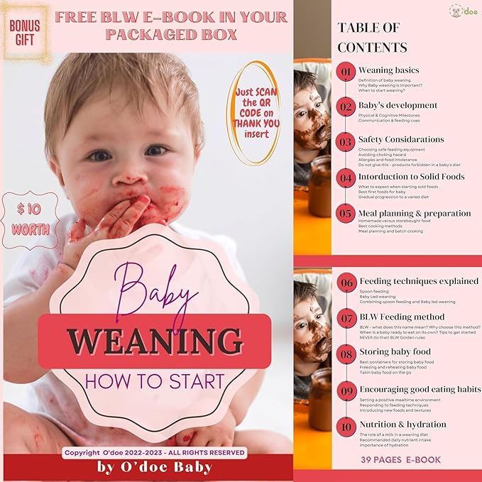 - SELF FEEDING SET: BLW E-book | 17-piece baby feeding set contains 1 x baby suction plate, 1 x suction plate lid, 2 x suction bowls, 1 x bamboo fork, 1 x bamboo spoon, 1 x sippy cup, 1 x sippy cup straw, 1 x sippy cup lid, 2 x baby bibs with catcher, 1 x first stage toddler fork, 1 x first stage toddler spoon, 1 x steel spoon, 1 x steel fork, 1 x fruit feeder, 1 x fruit juicer cap, 1 x finger toothbrush, and 1 x toothbrush cover. Designed to cater to all your baby's mealtime needs.