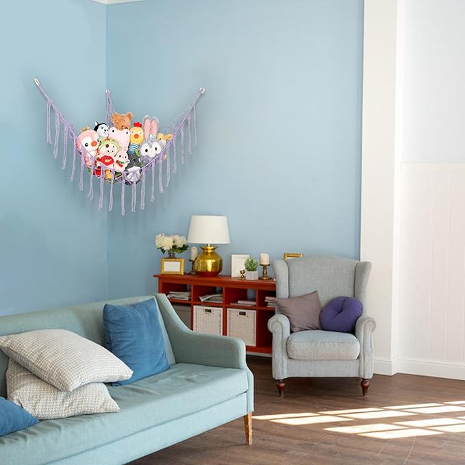- Net For Stuffed Animals In The Corner: The corner plush toys net holder can make the most of the corner position, keep house tidy, and free up valuable space for your children to play. It is an alternative to bean bags, storage boxes, baskets and litter boxes.