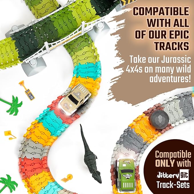 • 【Ready for Any Racetrack 】- These awesome dinosaur jeeps are ready to race! Completely compatible with all of our racetrack sets, Dinosaur racetrack, Flashtrack and Construktor! They also work perfectly on major themed cars race track!