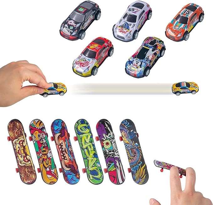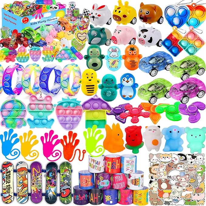 - Assortment premium party favors toys set: 4 pop bracelets, 4 cute pop fidget toys, 4 mini pop keychains, 4 animal pull back cars, 4 mini skateboards, 4 pull back cars, 5 tumbler toys, 5 mochi squishy toys, 5 sticky hands, 5 spinners, 10 slap bracelets, 60 stickers. Total 114 pcs party favor toys for kids.