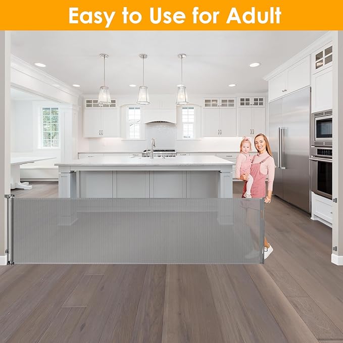 - Easy to Use for Adult: adults can open the retractable pet gate with one hand, while children cannot. The extra long baby gate come with detailed installation instructions and is very easy to install.