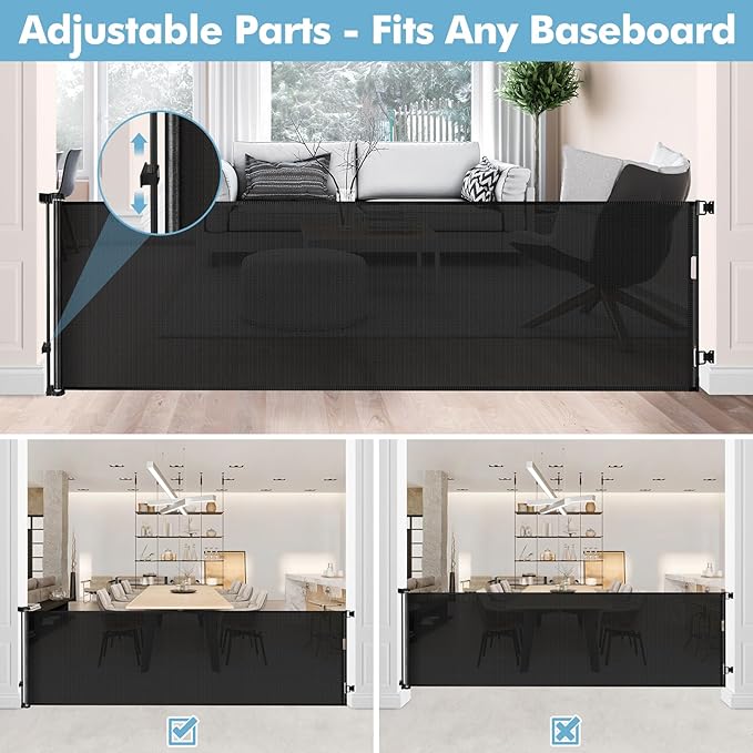 - Adjustable Parts - Fits Any Baseboard: The lower bracket of the retractable baby gate slides up and down to adjust to different heights of the baseboard. Makes mounting the large baby gate easier and safer.