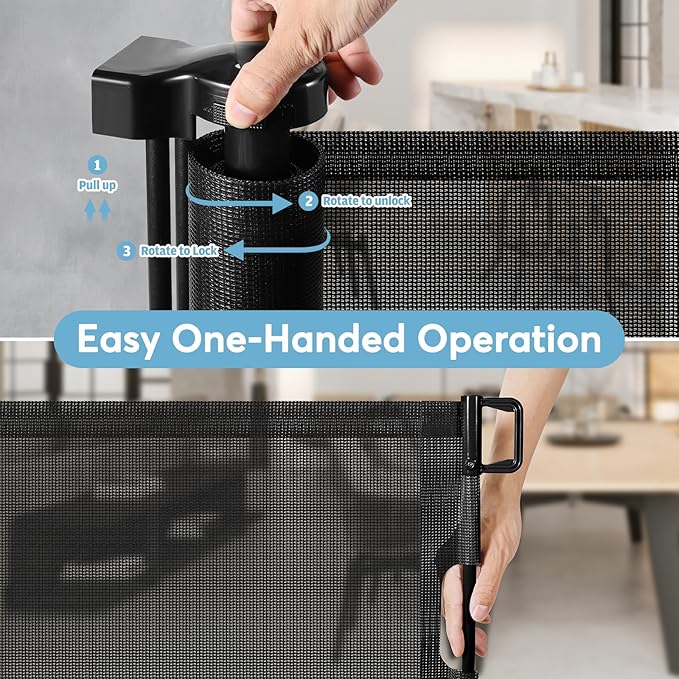 - Easy One-Handed Operation: Our retractable dog gate has a one-handed locking and unlocking mechanism. Once locked, the retractable fence securely closes to prevent accidental opening by babies and pets.