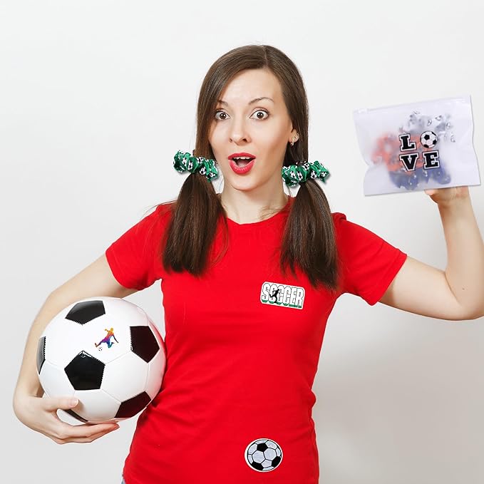 - Soccer scrunchies hair ties and bracelets:these soccer scrunchies hair have 10 different colors,they are crafted with quality and soft fabric material, which are smooth and comfortable to touch, with good stretchy performance, suitable to hold thick, long, or most kinds of hair;the soccer bracelets come in a delicate appearance, there are 20 pieces with 10 different colors,and these soccer bracelets are adjustable, and features a sturdy adjustable clasp to hold in place; suitable for most wrists sizes