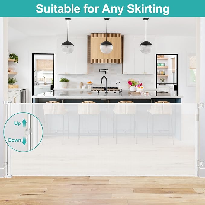 - 95" Extra Wide Retractable Gate : extra wide retractable dog gate is wide and tall enough so that there is no gap between the gate and the floor, and children and dogs cannot get under the extra wide retractable pet gate.