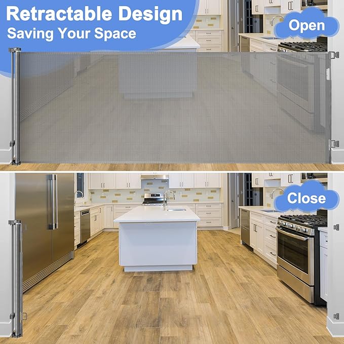 - Retractable Design: dog gates for the house extra wide is retractable and the mesh can be completely rolled up when you're not using them, taking up no space.