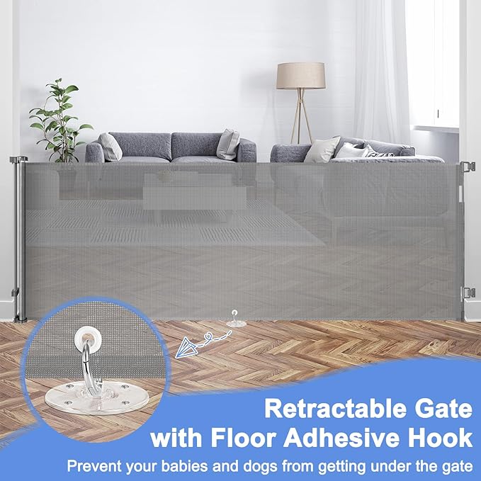 - Retractable Gate with Floor Adhesive Hook: extra large baby gate contains 2 floor hooks, which can be attached to the gate to prevent your children and dogs from getting under the retractable baby gate.