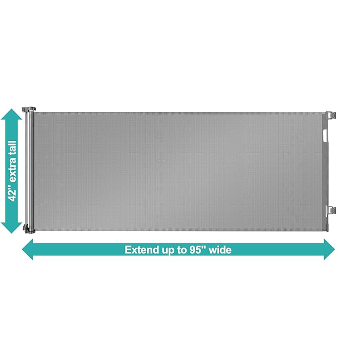 - Extra Tall and Extra Wide Retractable Gate: extra wide retractable dog gate is 42" tall and fit 0-95" wide openings. Mesh can be completely retracted away when not in use, saving you space.
