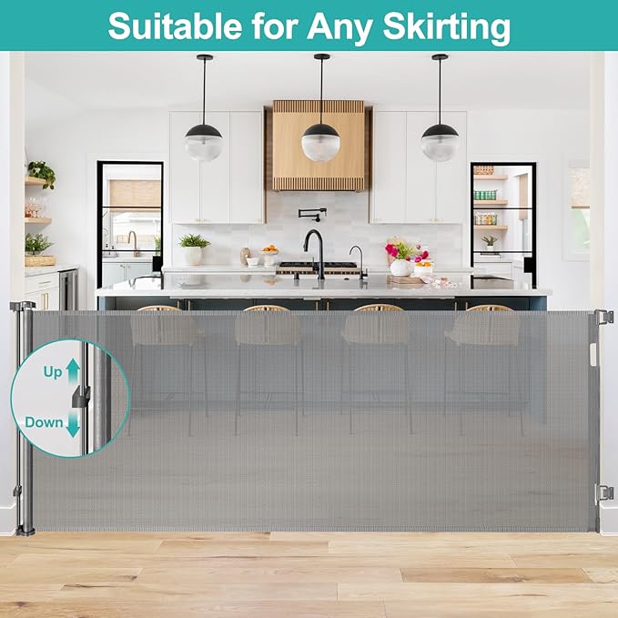 - 95" Extra Wide Retractable Gate: extra wide retractable baby gates is wide and tall enough so that there is no gap between the gate and the floor, and children and dogs cannot get under the extra wide baby gate.
