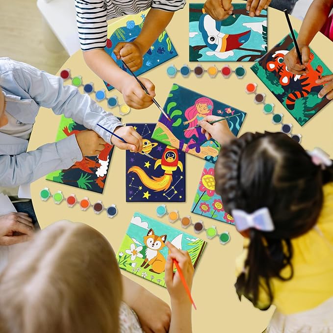 8 Packs Predrawn Canvas for Painting Kids Painting Canvas for Kids Painting Kits for Kids 4-8, 48 Paints, 8 Brushes 2 Easels, 8 6x8 Printed Canvas to Paint for Girls Boys and Beginners
