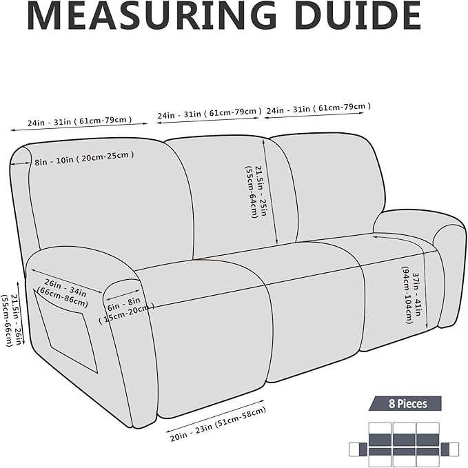 - Perfect Fit: This 8-piece recliner sofa cover is elastic enough to fit most standard recliner couches. It includes 3 back covers, 3 seat covers, and 2 arm covers with one right side pocket. This design ensures a wrinkle-free and customized look. It is suitable for both manual and electric recliner styles.
