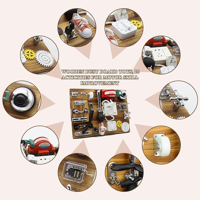 - [21 in 1 Large Wooden Busy Board] This wooden busy board is designed with trumpets, timer, dinner bell, key lock, faucet switch, shoe, manual music box, gear and so on 21 daily supplies functions,which can keep your kids busy for travel and improve motor skills.