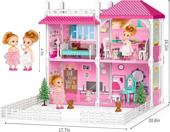 - Explore A Dolls' Toy: This villa playset(17.7*20.8*16.1 in) for kids features 2 storeys, 4 rooms, including family bathroom, sitting room, dining room, food toy and 2 doll toy figures, which encourages kids' hands-on ability to paly girls toys