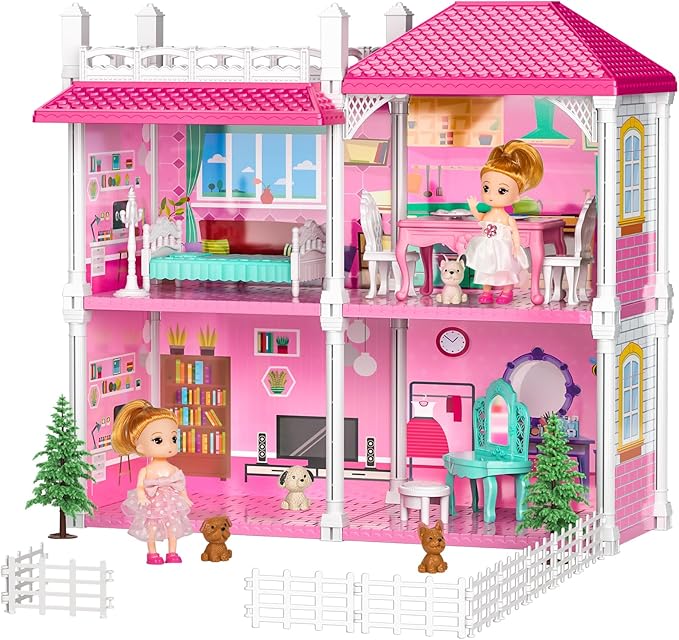 TEMI Villa Toys for 3 4 5 6 7 8 Years Old Girls - 2 Storeys 4 Rooms, Indoor Playset with 2 Dolls Toy Figures, Toys Furniture and Accessories, Pretend Girls Plays, Building Toys, Gifts Toy
