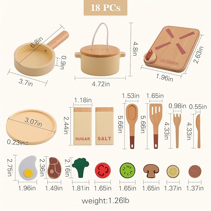 - 🍳【Better Quality Kitchen Toys】Our cooking toys have a smooth, burr-free wooden surface with rounded edges. Due to the material, our kitchen toys will not break and can be played with for a long time with confidence.