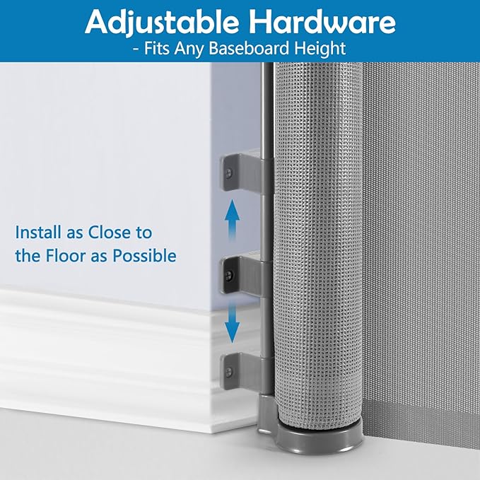 - Adjustable Hardware for Any Baseboard: No matter the height or style of your home's baseboards, our extra long baby gate comes with adjustable hardware, ensuring a seamless fit without the need for additional shims.