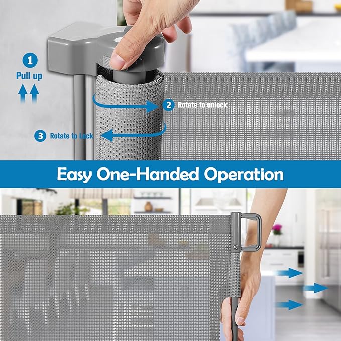 - Secure Locking Mechanism for Easy Adult Use: Our wide retractable gate features a locking system that ensures a secure hold when locked. Adults can easily operate it with just 1 hand, while also preventing children from opening it.