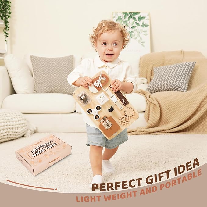 - Learning Toy for Toddlers: Ignite your little one’s curiosity with our Montessori Busy Board. This baby & toddler toy is crafted to elevate early developmental skills through sensory play, fostering hand-eye coordination, cognitive abilities, and problem-solving prowess.