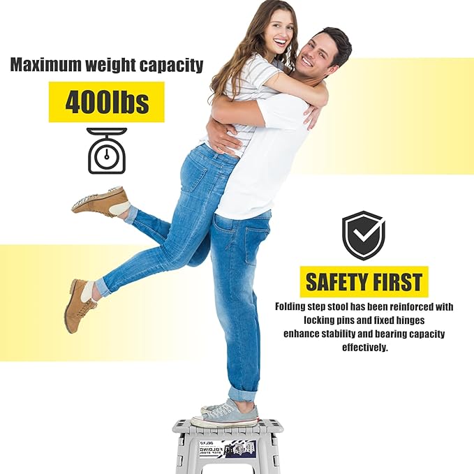 - Safe Upgrade Step Stool : Features improved the folding bar, which can prevent from collapse inward while steping on it. Delxo have designed a safety stop gap feature that allows the foldable step stool to prevent being squashed, great for adults. Four round corner super safe protect your body from clashing. All of this design is put your safe first