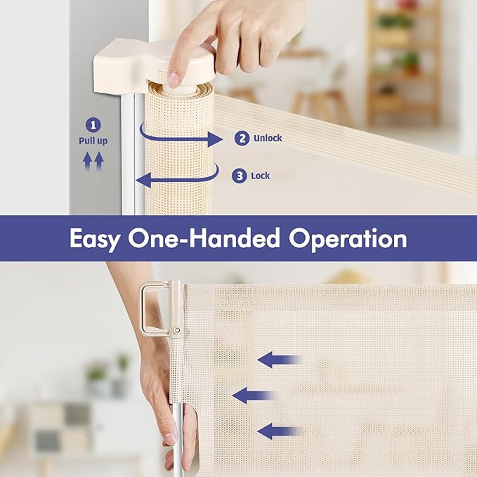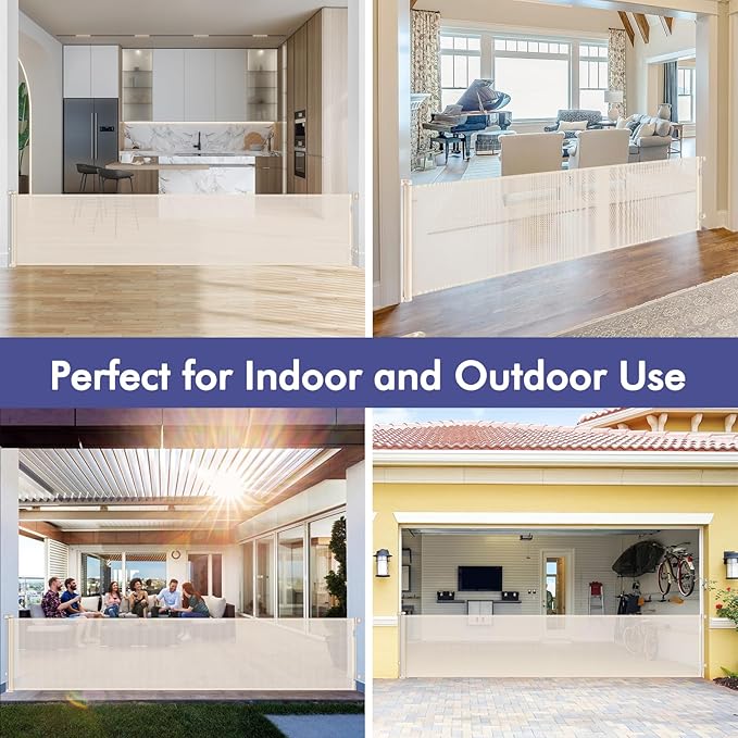 - [Retractable Gate to Save Space] - This retractable baby gate is easy to use in high traffic areas. When not in use or when guests are visiting, the extra large baby gate retracts to save space. Give your home more space and flexibility, and you don't have to worry about tripping over a bulky gate that's always in the way.