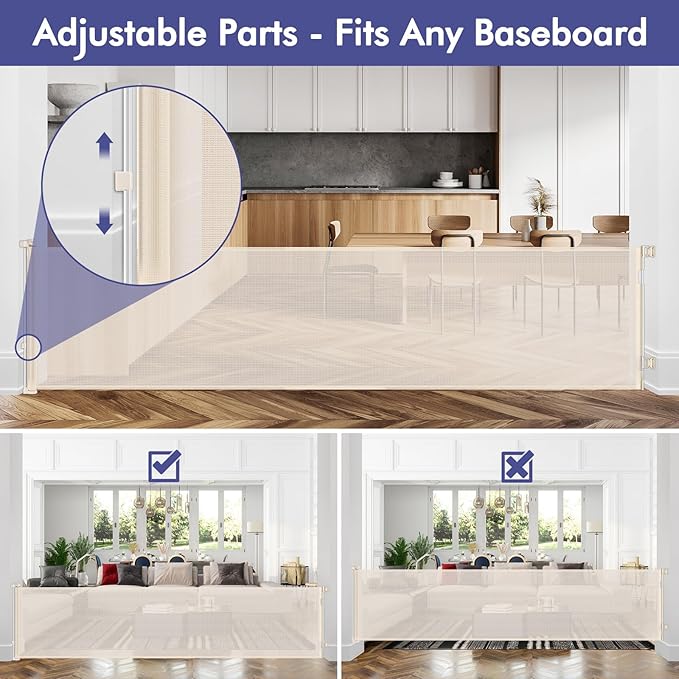 - [Fits Any Baseboard] - The bottom hardware of the retractable dog gate can slide up and down to fit any height baseboard, no need to buy extra spacers, making it easier and safer to install.