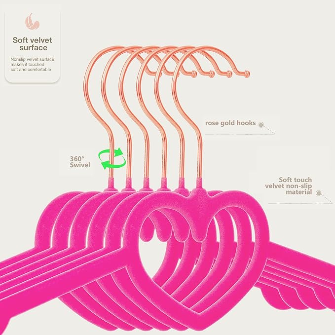 - 💖【360° Swivel】- The children's hangers feature a 360° swivel rose gold hook that allows for the easy adjustment of clothing direction, 1.65'' open size fits most standard rods meets your different hanging angle needs.