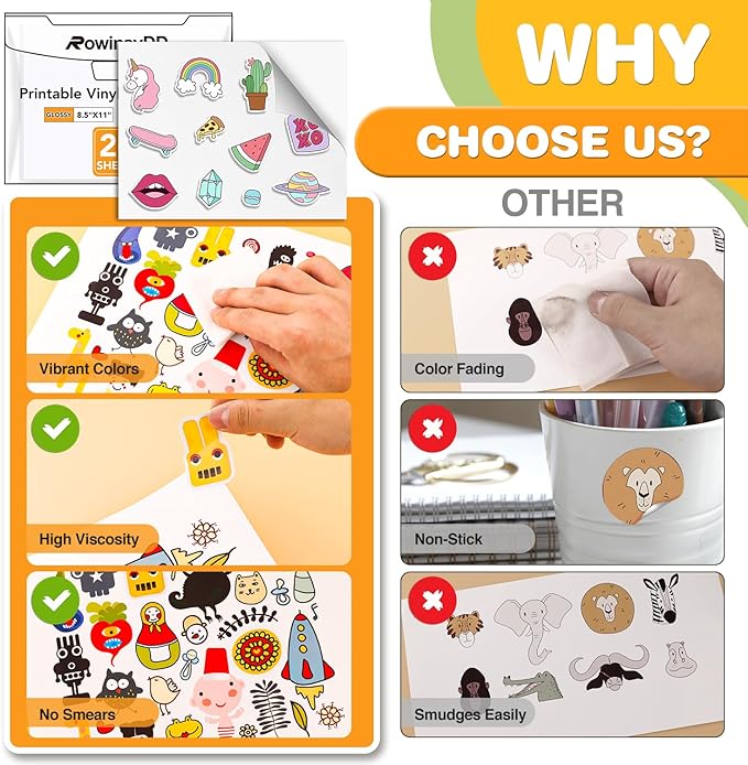 - Printable Vinyl Sticker Paper:We offer 20 sheets of 8.5x11 inch waterproof printable glossy sticker paper. you can create gorgeous waterproof labels for multi-purpose use both indoors & outdoors with the printable vinyl sheets.
