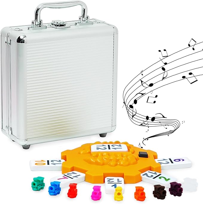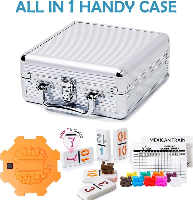 - ALL IN 1 SET: Our double 12 Mexican Train Dominoes set comes with everything you need to have a good time with friends including 91 Numbered Double Tiles, 9 Colorful Trains, a Train Whistle hub in a handy Aluminum Framed Case together with a score pad and basic instruction to make sure you have enough to play with up to 2-8 Players.