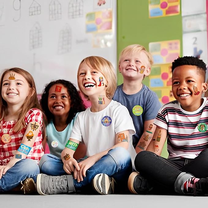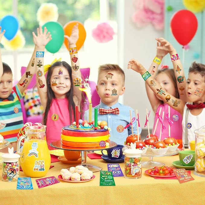 - 【Christian Religious Gifts for Kids】: You will receive 98 PCS Bible Verses Jesus party favors includes: 12 pieces mini religious notebooks,12 pieces button pins, 12 pieces religious bracelets, 50 pieces bible stickers, 12 sheet temporary tattoos. All of christian gifts are printed with motivational messages and colorful elements patterns which will be liked by children!