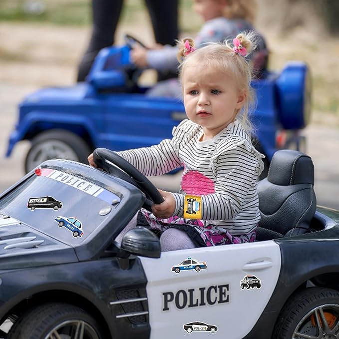 - Police Party Decoration: Each of the officer slap bracelets length about 8.67 inches, and its width is about 1.18 inches, coordinate with its flexible and stretchable feature, which can be stretched to fit different hand sizes; Police car stickers length about 2~3.5 inches;and its width is about 1.5~3 inches, reusable and durable, remove easily without residue