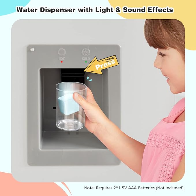 - 🍳🥄【Kid Play Kitchen with Sound & Light】This wood kitchen play features a faucet & sink, stove, clock and knobs with sound, oven, microwave, refrigerator & phone and includes some kitchen accessories toys(1 x pot with lid, 1 x pan, 3 x stainless steel cooking utensils). Importantly, a water dispenser with light and sound is added, which realistically simulate pouring water.